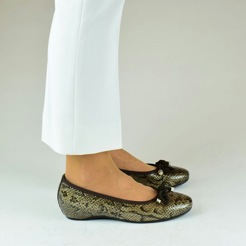 Γόβες δερμάτινες τύπου φιδιού flat μπαλαρίνες μπεζ χακί  με εσωτερική πλατφόρμα 2 cm