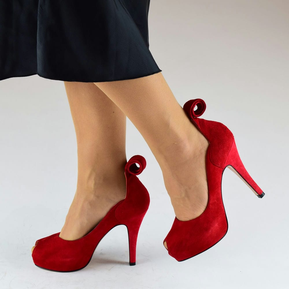 Γόβες peep toe δερμάτινες καστόρινες σε κόκκινο με τακούνι 9,5 cm και πλατφόρμα εσωτερικά 2,5 cm