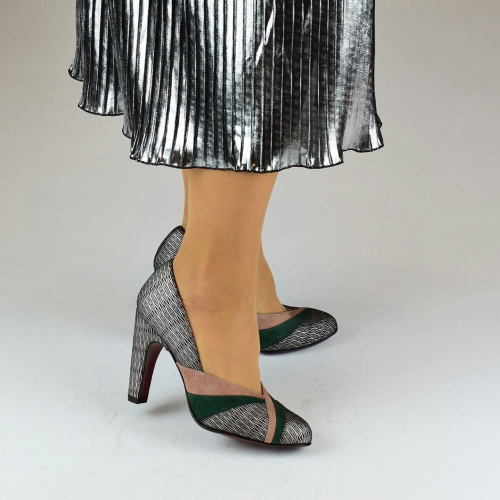 Γόβες δερμάτινες σε γκρί αποχρώσεις με πράσινες και σομόν λεπτομέρειες.Τακούνι 8,5 cm με εσωτερική πλατφόρμα 1 cm