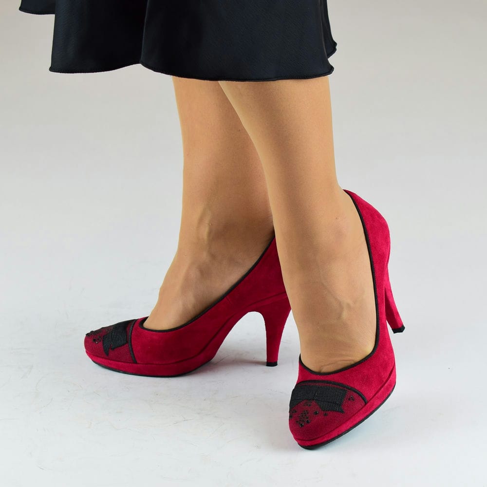 Γόβες δερμάτινες καστόρινες σε κόκκινο με λεπτομέρεια μαύρη μπροκάρ στη μύτη και τακούνι 8 cm με πλατφόρμα 1 cm