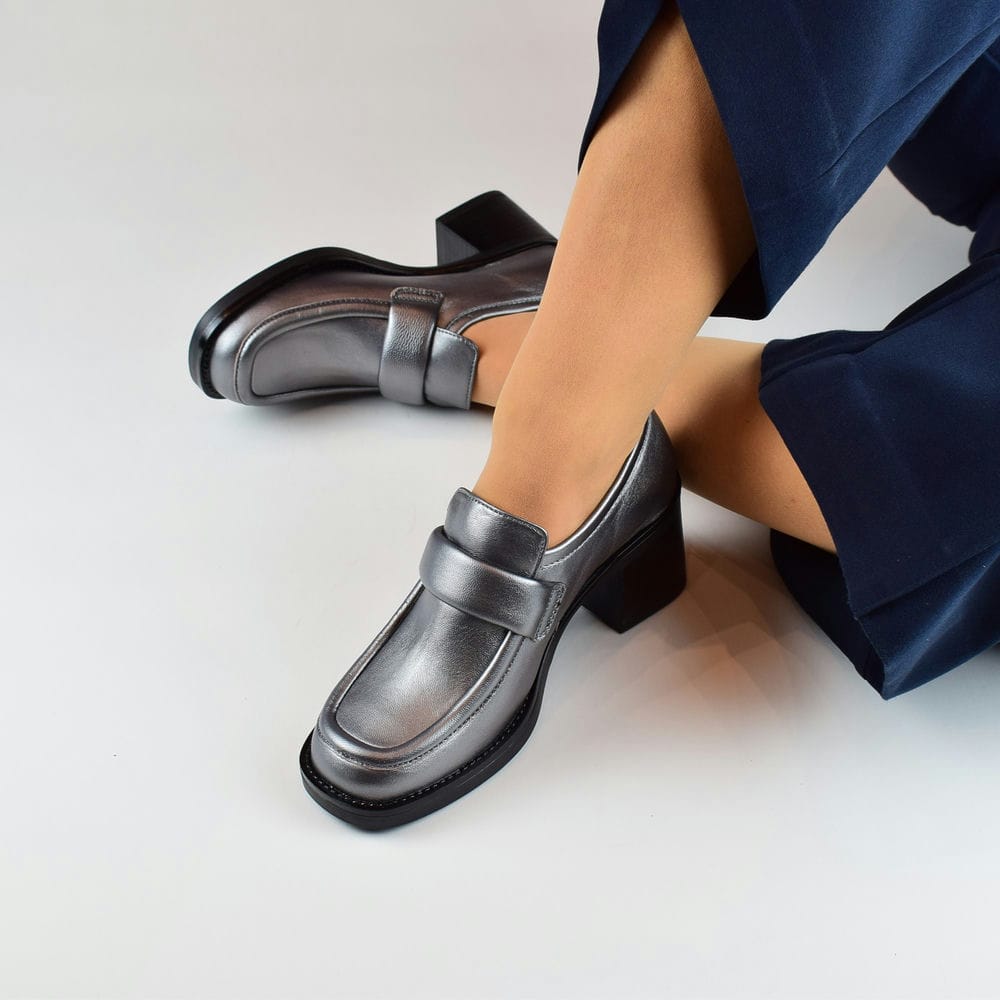 Μοκασίνια δερμάτινα γκρι ασημί με τακούνι 4,5 cm