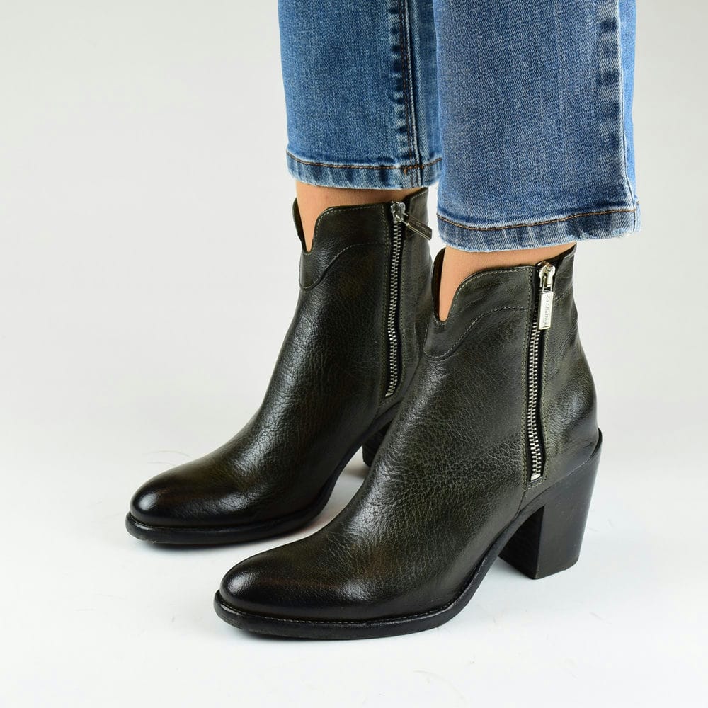 Μποτάκια δερμάτινα χειροποίητα με δύο φερμουάρ ραφτά σε μαύρο ανθρακί με τακούνι 5,5 cm