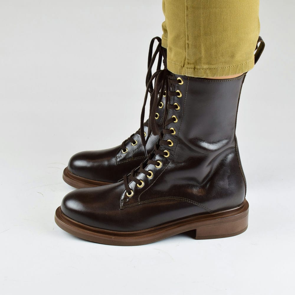Μποτάκια δερμάτινα με κορδόνια και φερμουάρ σε σκούρο καφέ