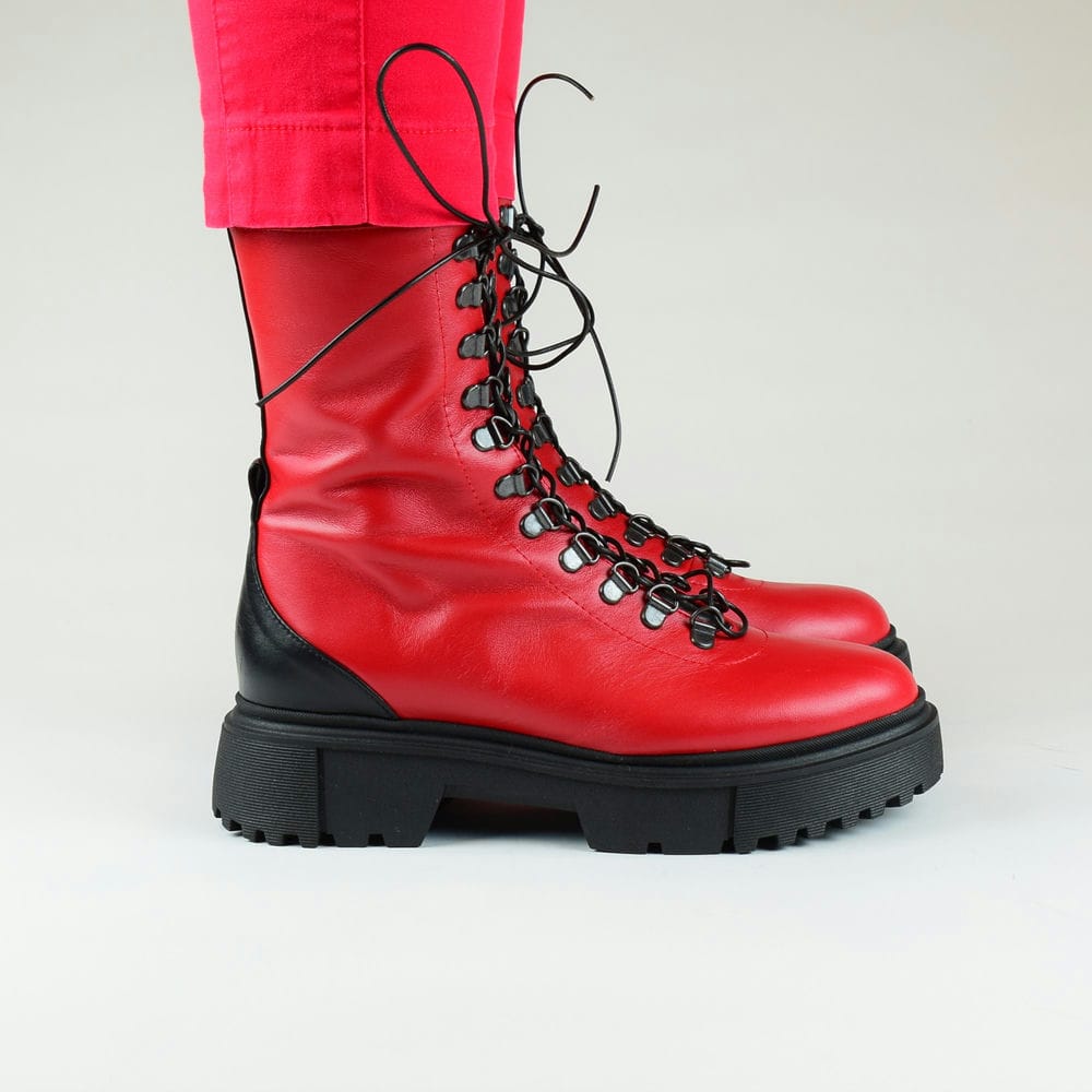 Μποτάκια δερμάτινα combat boots σε κόκκινο με κορδόνια και φερμουάρ