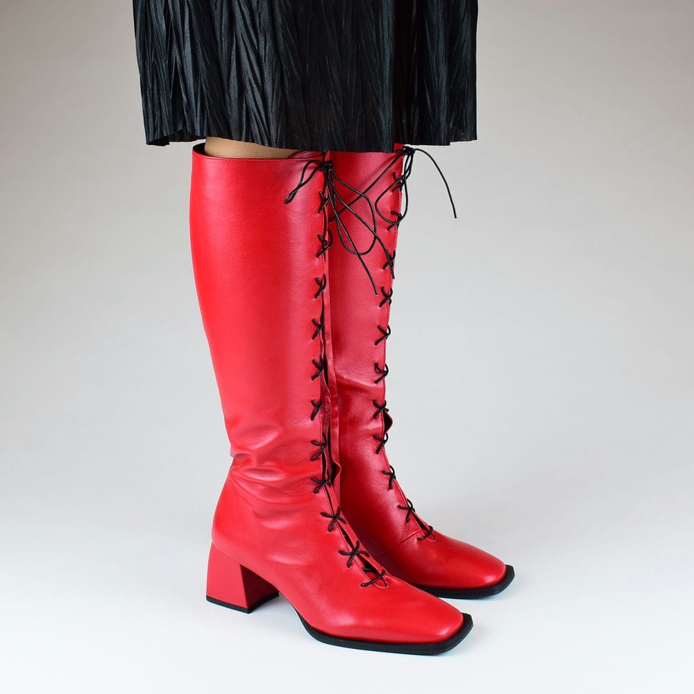 Μπότες δερμάτινες σε κόκκινο με κορδόνια και φερμουάρ με τακούνι 4,5 cm