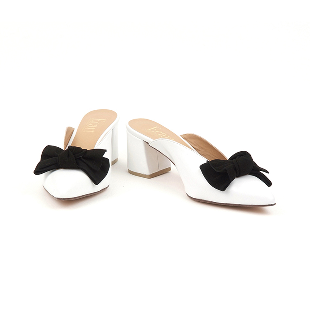 Mules δερμάτινα μυτερά σε λευκό με μαύρο φιόγκο και τακούνι 5 cm