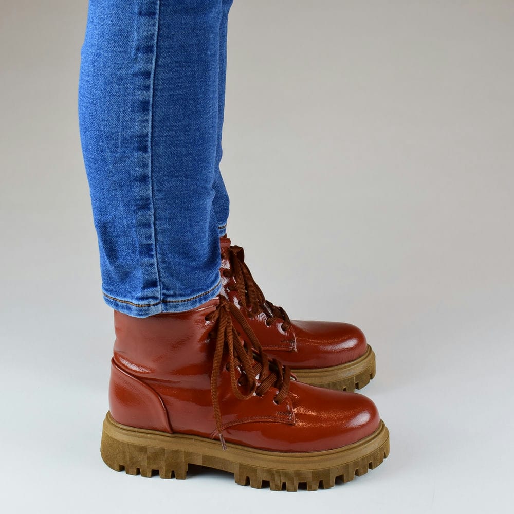 Μποτάκια δερμάτινα λουστρίνι combat boots σε ταμπά